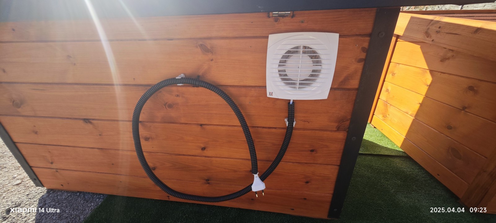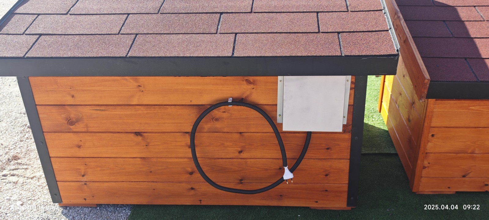 ➡️ Funguje na 230 V, napájací kábel je vyvedený na zadnej strane búdy. Búdu vždy umiestnite k stene alebo pevnému predmetu, aby bol kábel chránený.